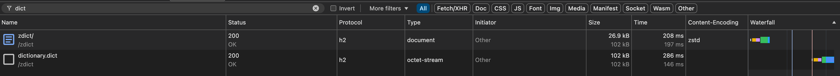 - Content Encoding: dcz ( this is the type for dictionary compressed Zstandard )